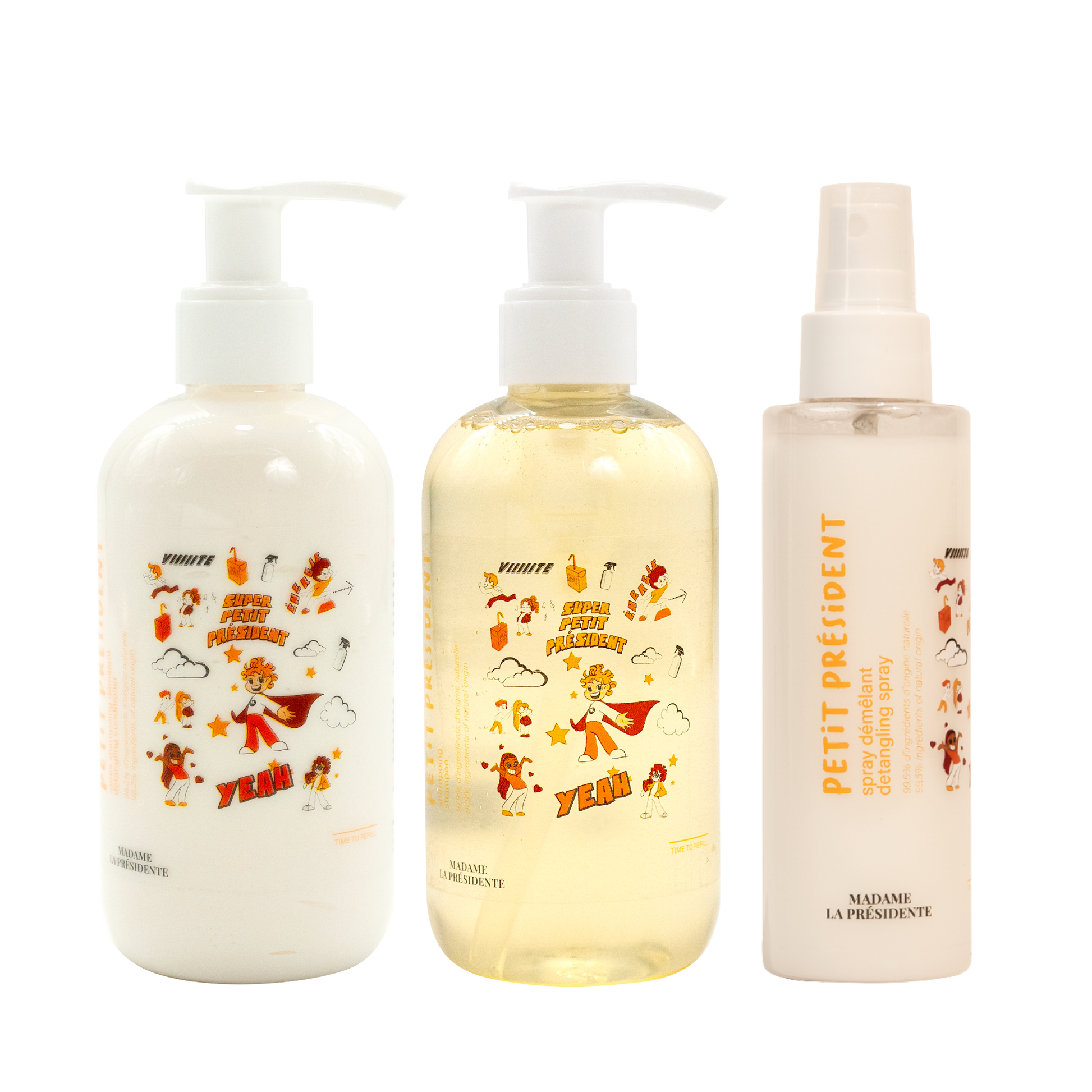 Shampoing Petit Président (250ml) :Produit lavant doux destiné à prendre soin des cheveux des plus petits. Il convient à tous les types de cheveux texturés, notamment aux cheveux délicats et aux cuirs chevelus sensibles des enfants. Sa formule développée en laboratoire nettoie en douceur sans agresser les racines. Il régule le microbiome du cuir chevelu et respecte l’équilibre des plus sensibles.
